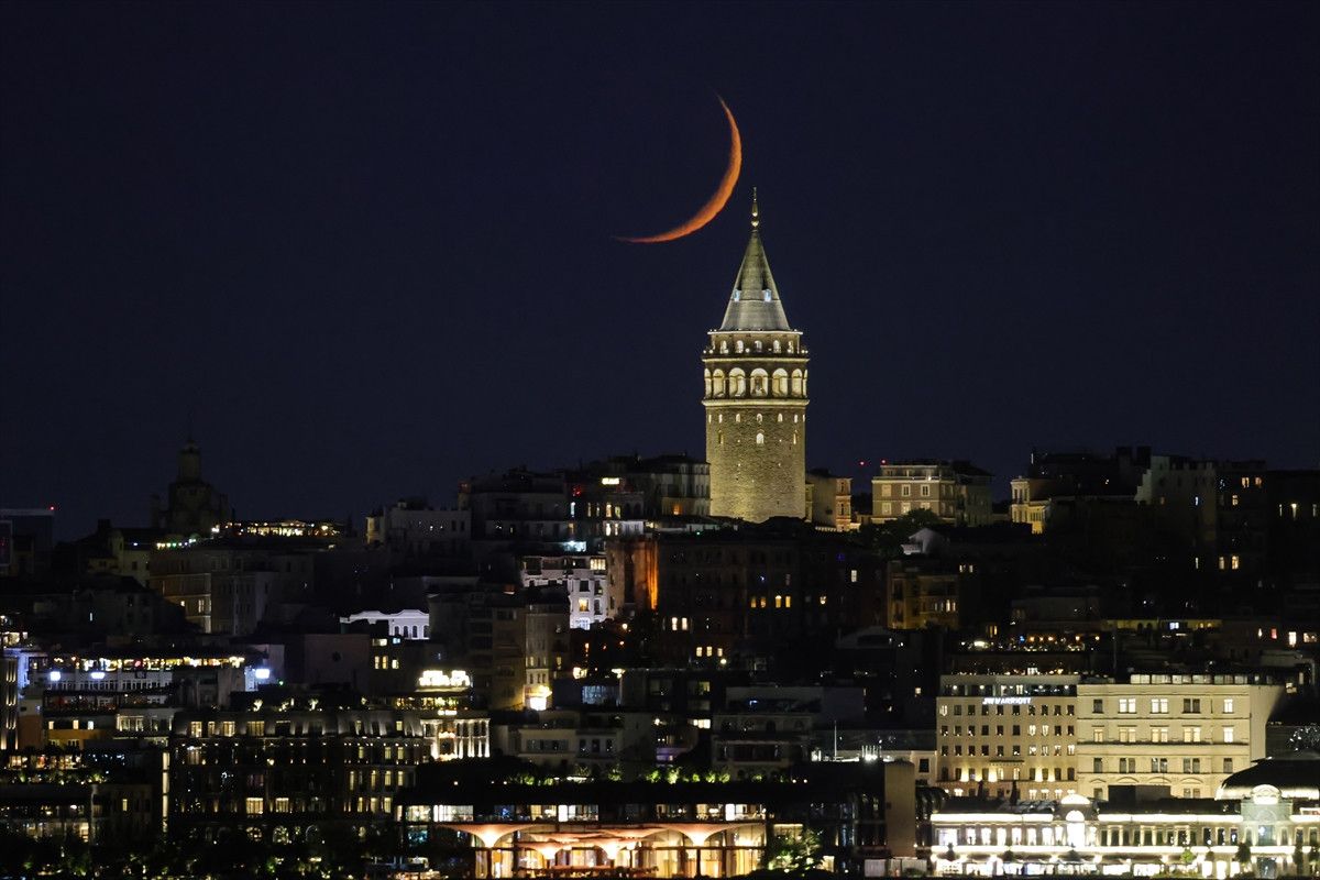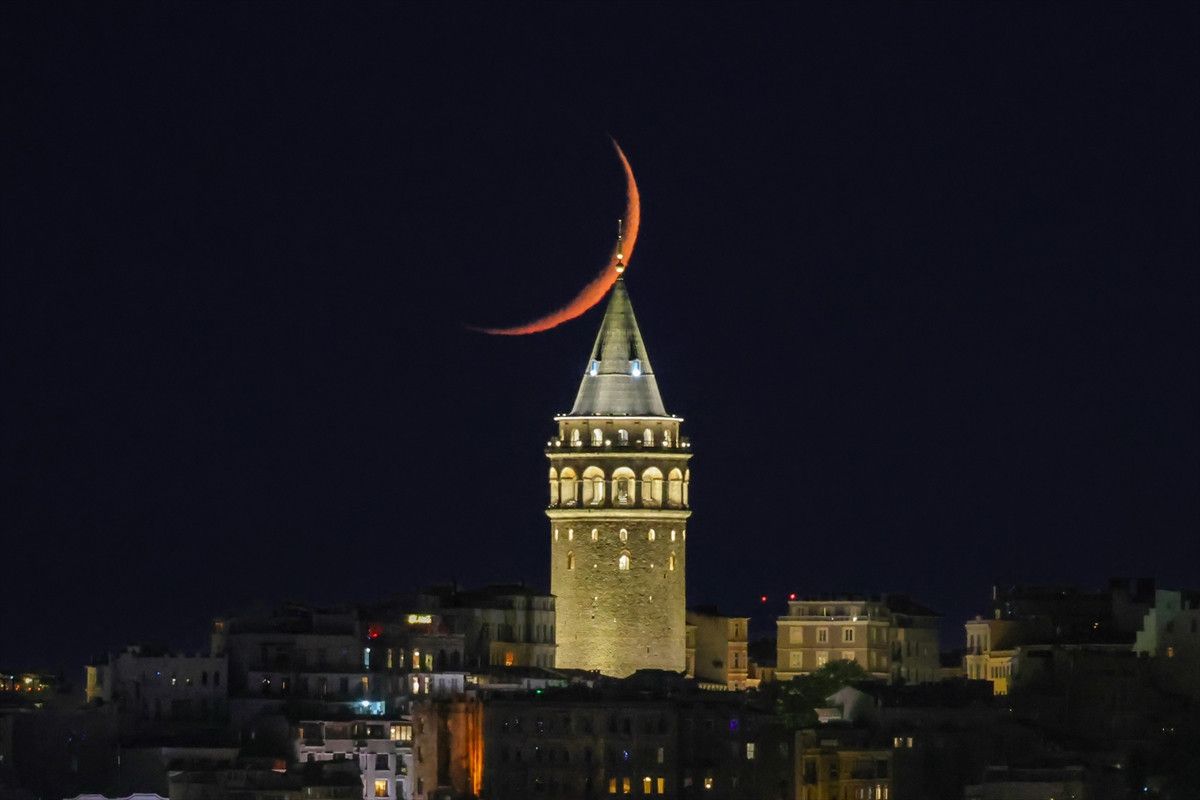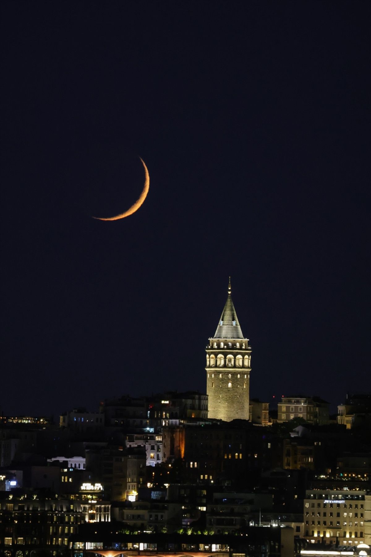 İstanbul’da akşam saatlerinde gökyüzünde beliren hilal, Galata Kulesi ile tıpkı karede görüntülendi.