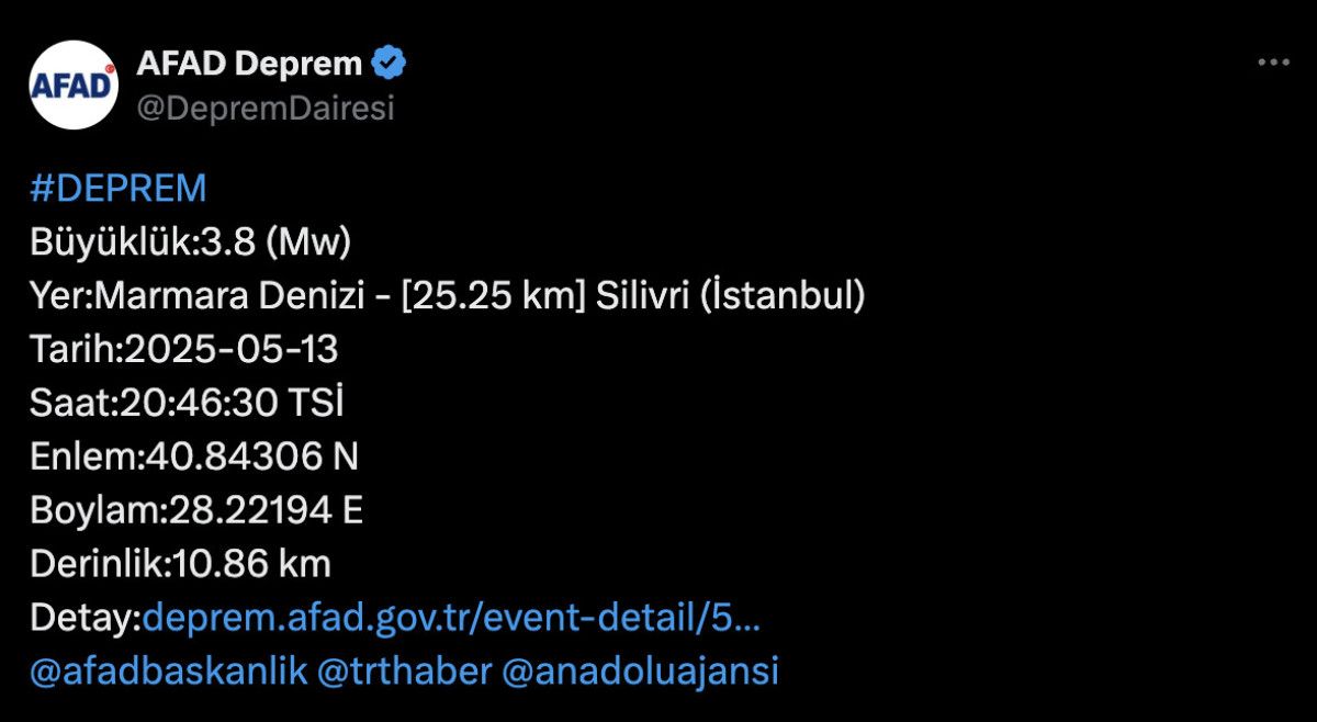 Afet ve Acil Durum Müdürlüğü (AFAD) tarafından yapılan açıklamada, İstanbul’da 20.46’da hissedilen depremin yerin 10.86 kilometre derinliğinde gerçekleştiği ölçüldü.