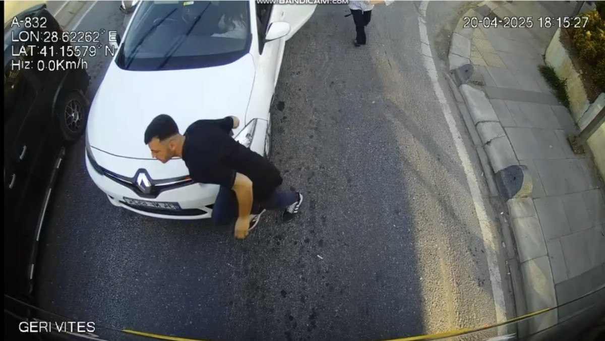 Görüntülerde, trafikte duran otobüsün arkasındaki otomobilden inen 2 kişinin otobüse doğru koştuğu, şoförle tartıştıktan sonra şüphelilerden birinin otobüsün camına vurup kırdığı anlar yer alıyor.