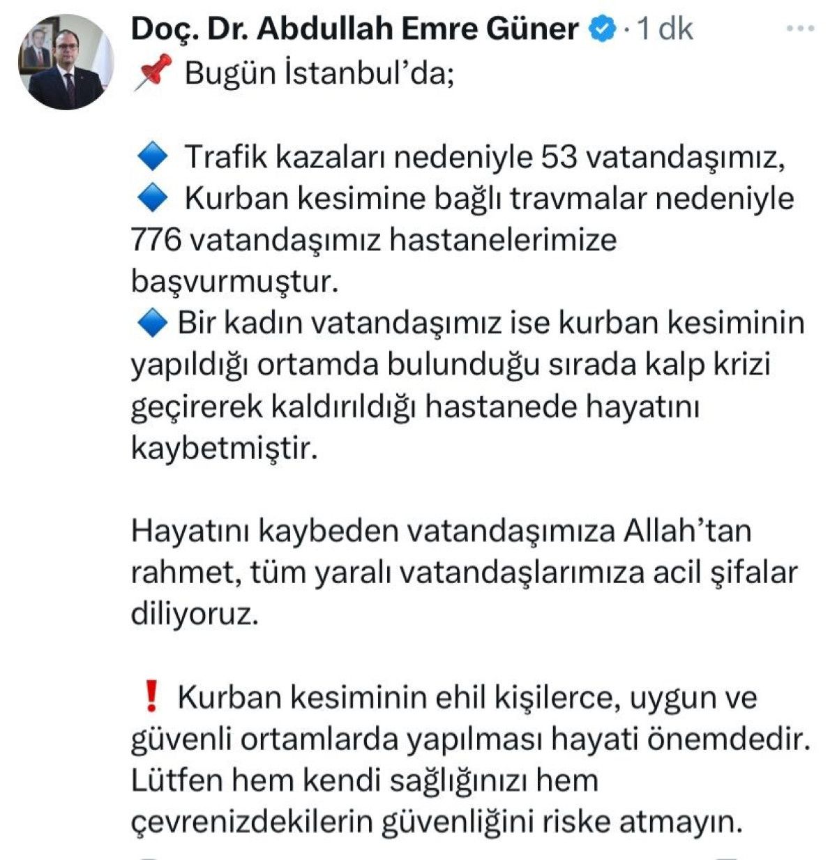 Bugün İstanbul’da trafik kazaları nedeniyle 53 vatandaşımız, kurban kesitine bağlı travmalar nedeniyle 776 vatandaşımız hastanelerimize başvurmuştur. Bir bayan vatandaşımız ise kurban kısmının yapıldığı ortamda bulunduğu sırada kalp krizi geçirerek kaldırıldığı hastanede hayatını kaybetmiştir.