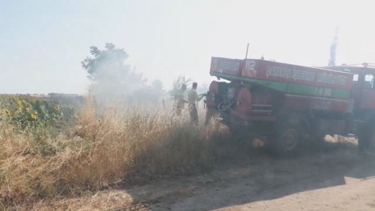 Ekiplerin yangına müdahalesi sırasında bir itfaiye aracı otluk alanda, alevlerin ortasında kaldı.