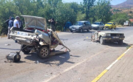 Yolun ortasındaki çelik bariyerlere de vuran otobüs, bariyerlerin üzerinde çıkarak asılı kalırken, otobüsün çarpmasıyla savrulan araba ise bariyerlere vurarak durabildi.