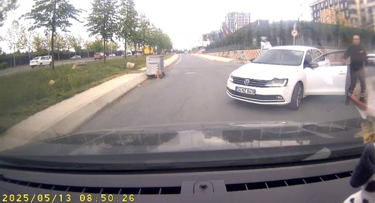 Aracından inen şoför diğerine “Canımı sıkma sabah sabah benim” derken, imkanı olduğu halde yoluna devam etmeyen şoför ise arabanın çekilmesini istedi.