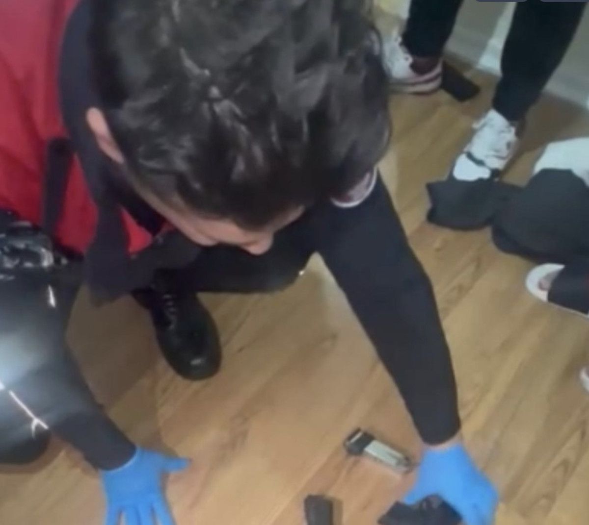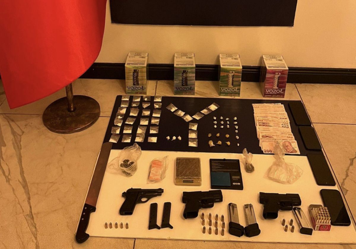 Salonda, mutfakta ve balkonda yapılan aramalarda ele geçirilen 41 adet mermi, 2 adet yedek şarjör, 6 adet MDMA hususu, 34 adet Line unsuru, 4 adet kokain ve 4 kutu elektronik sigaraya el konuldu.