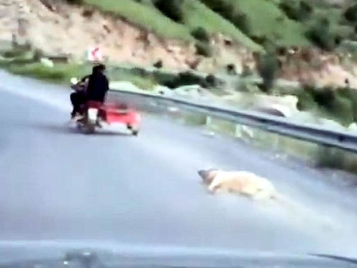 Kahramanmaraş’ta kaydedilen imajlarda 2 kişi kullandıkları sepetli motosikletin ardına bağladıkları köpekle yolda ilerledi.