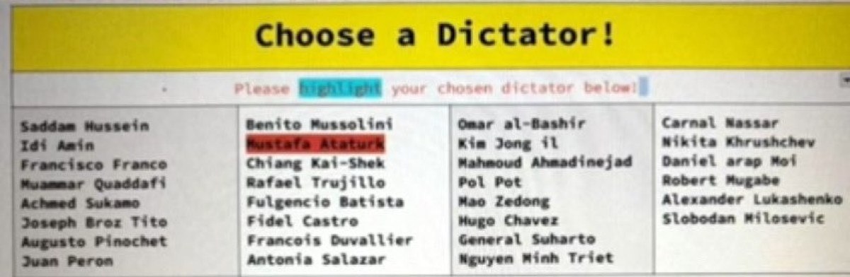 Ancak ödevde, Türkiye Cumhuriyeti’nin kurucusu Mustafa Kemal Atatürk’ün adı “diktatörler” listesine ‘Mustafa Atatürk’ olarak eklendi.