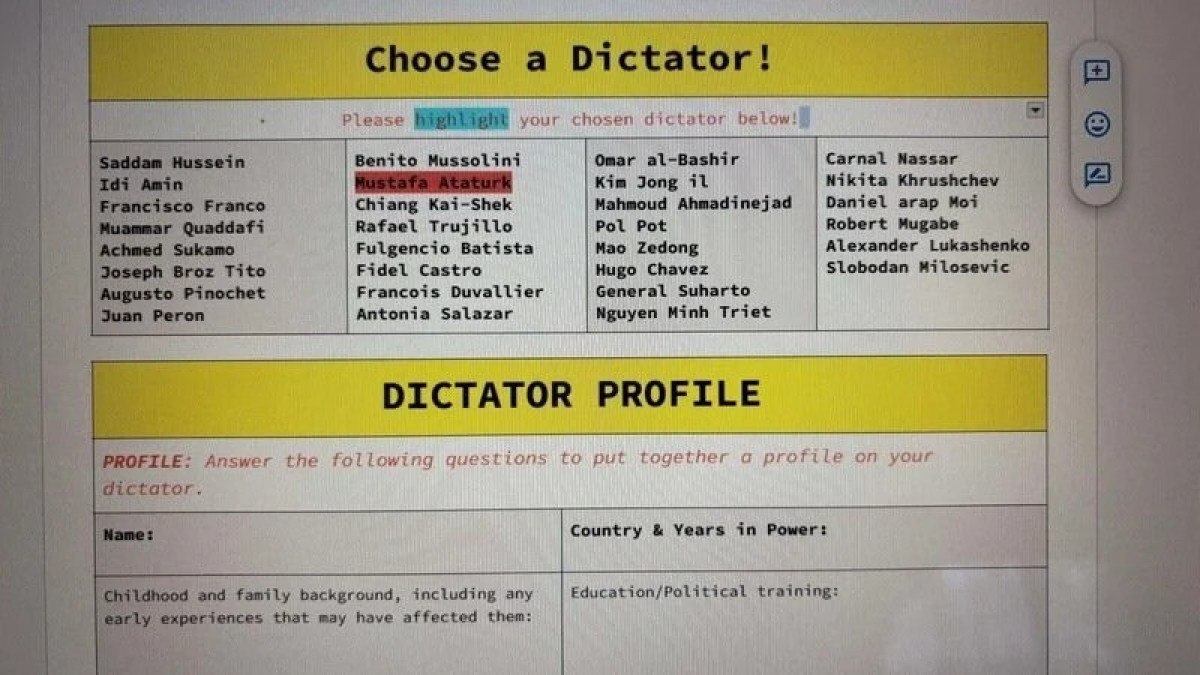 12. sınıf öğrencilerine verilen ödevde Mustafa Kemal Atatürk; Benito Mussolini, Saddam Hüseyin ve Fulgencio Batista gibi eli kanlı diktatörlerle aynı listeye alındı.