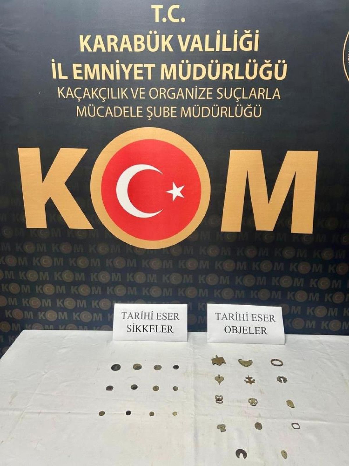Eskipazar ilçesinde düzenlenen operasyonda farklı devirlere ilişkin olduğu bedellendirilen 12 adet sikke ve 14 adet tarihi nesne ele geçirildi.