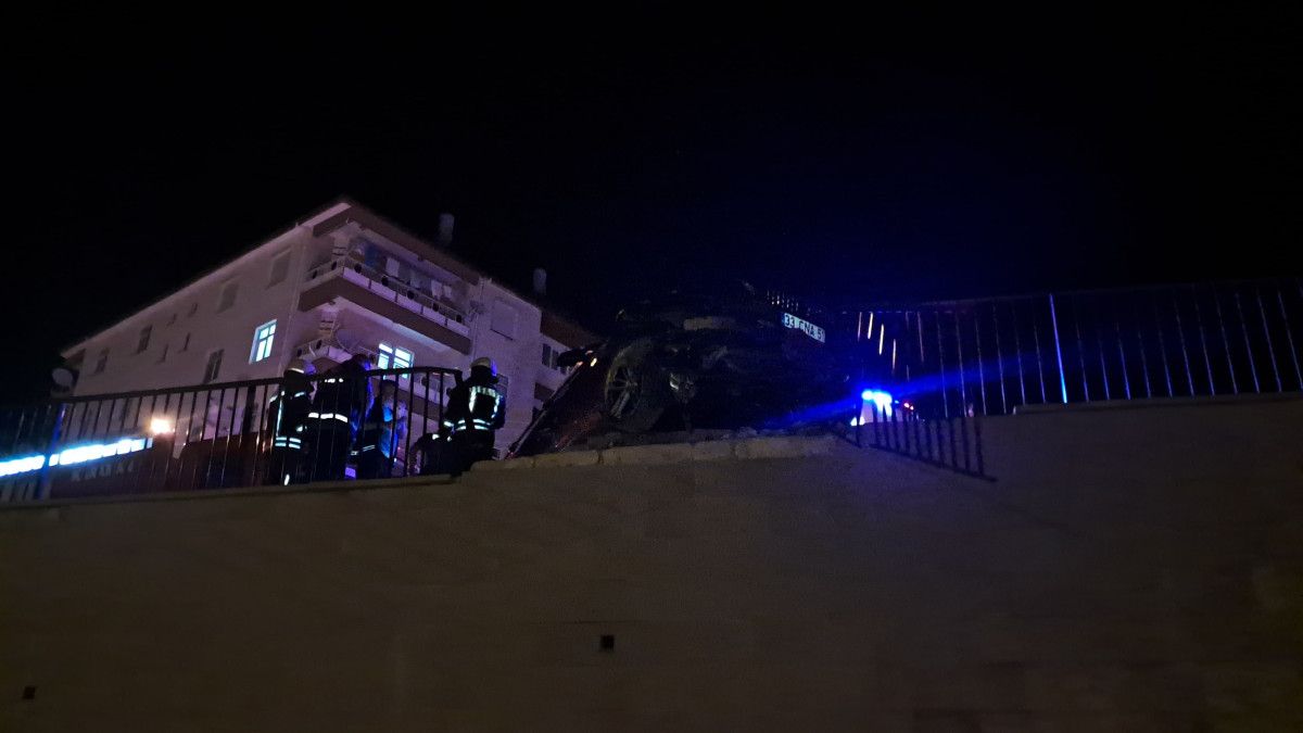Hızını alamayarak kaldırımı aşan araç daha sonra üst geçidin demir bariyerine çarparak asılı kaldı.