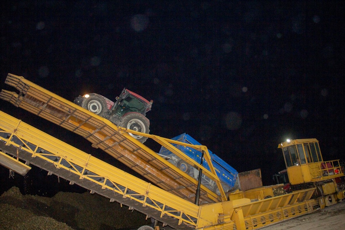 Kars’ın Akyaka ilçesindeki çiftçiler, kar bastırmadan şeker pancarlarını toplamak için gece gündüz mesai yapıyor.
