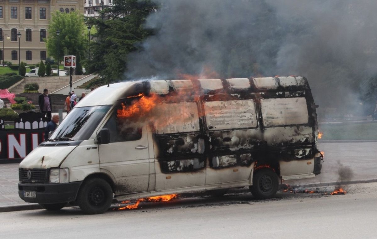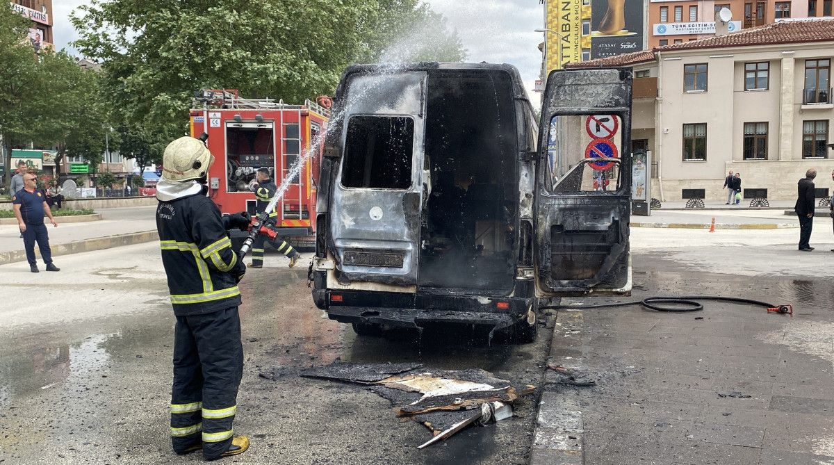 Aracın içinden aldığı şişedeki akaryakıtı aracın üzerine döken şahıs, panelvan aracı ateşe verdi.