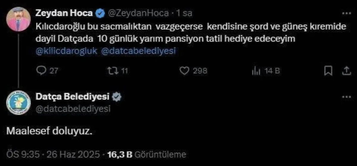 X üzerinden paylaşım yapan bir hesabın Kılıçdaroğlu’nun dönmeyi kabul etmemesi halinde Datça’da tatile göndermek istediğini paylaşmasına ait belediyeden enteresan bir karşılık geldi.