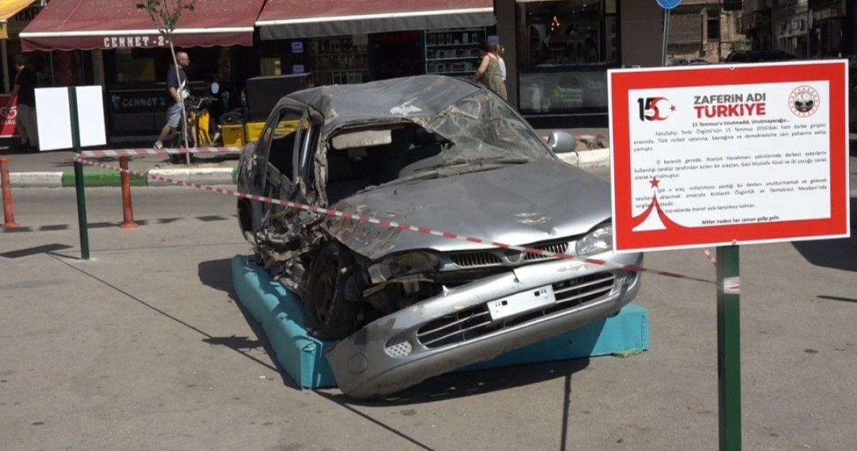 15 Temmuz gecesi, Atatürk Havalimanı yakınlarında darbeci askerler tarafından tankla ezilen araba sergileniyor.