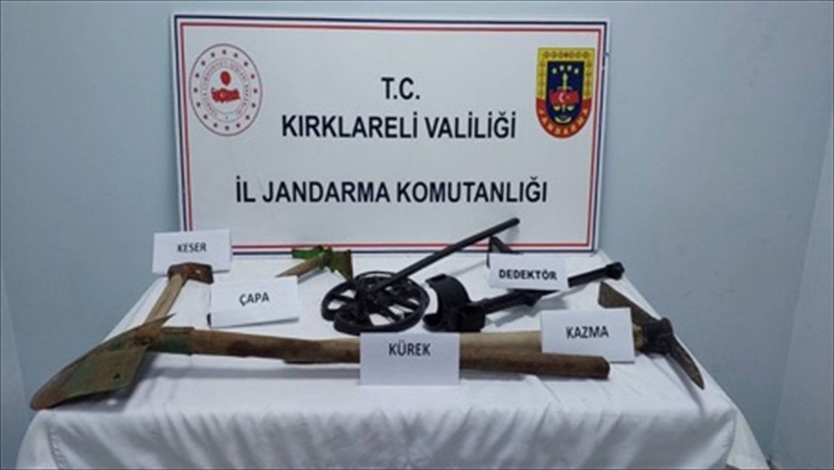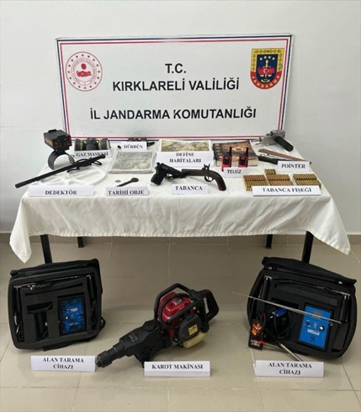 Şüphelilerin ikametlerinde yapılan aramalar sonucu 2 tabanca, 330 adet tabanca mühimmatı, 2 altın sikke, 8 dedektör, 125 sayfa define haritası, 13 kilogram patlayıcı unsur, 100 metre elektrik kablosu, 4 el imali fünye, 2 hilti, 6 alan tarama aygıtı, 3 karot makinesi, 3 kamera, 2 telsiz, gaz maskesi ve hafriyat ekipmanları ele geçirildi.