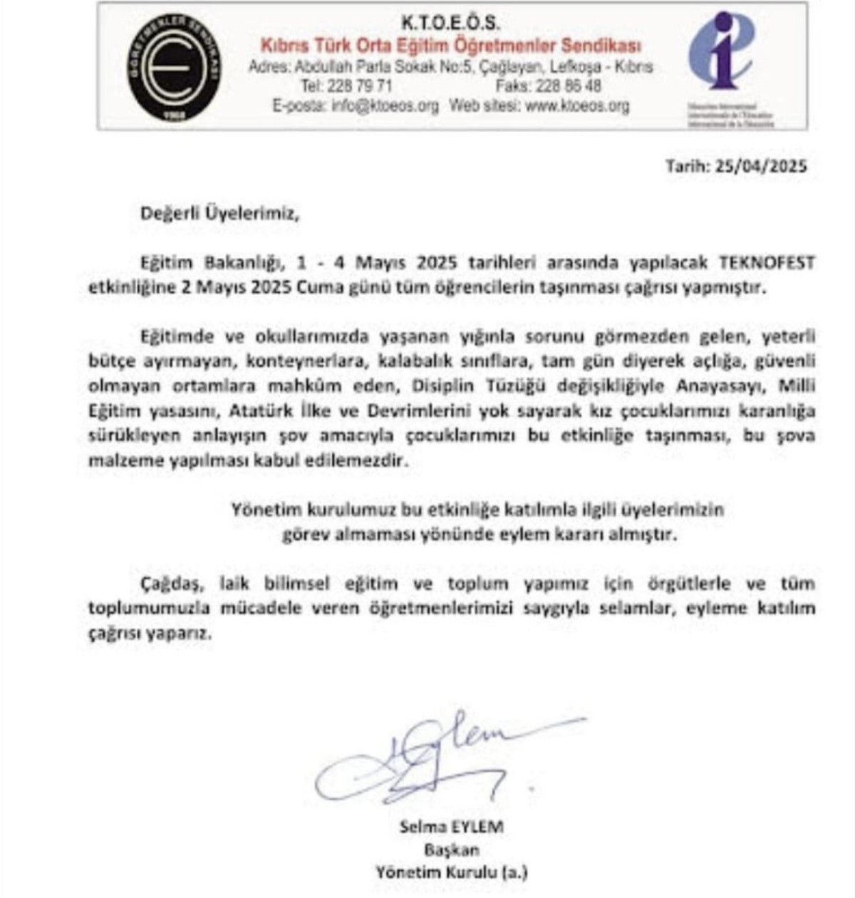 Türkiye’ye yönelik açıkça tehditlerde bulunan Kıbrıs Türk Orta Eğitim Öğretmenler Sendikası Başkanı Selma Eylem’in imzasıyla paylaşılan bildiride TEKNOFEST’e karşı çıkıldı.
