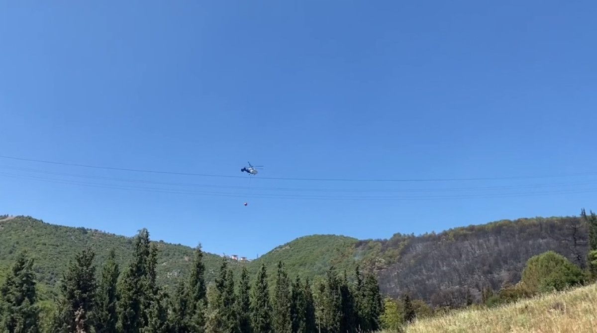 Söndürme çalışmalarına helikopter de dayanak verdi.
