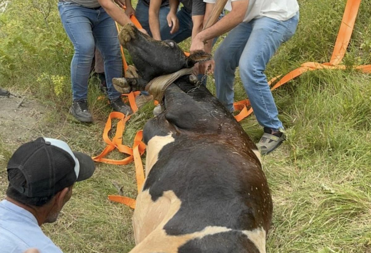 Halatlarla bağlanan inek, yaklaşık 3 saat süren titiz bir operasyonun akabinde yara almadan kurtarıldı.