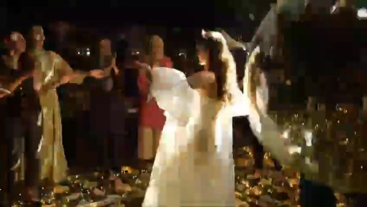 Görüntülerde, gelinin dans ettiği anda disko topunun gelinin üstüne düştüğü görülüyor.