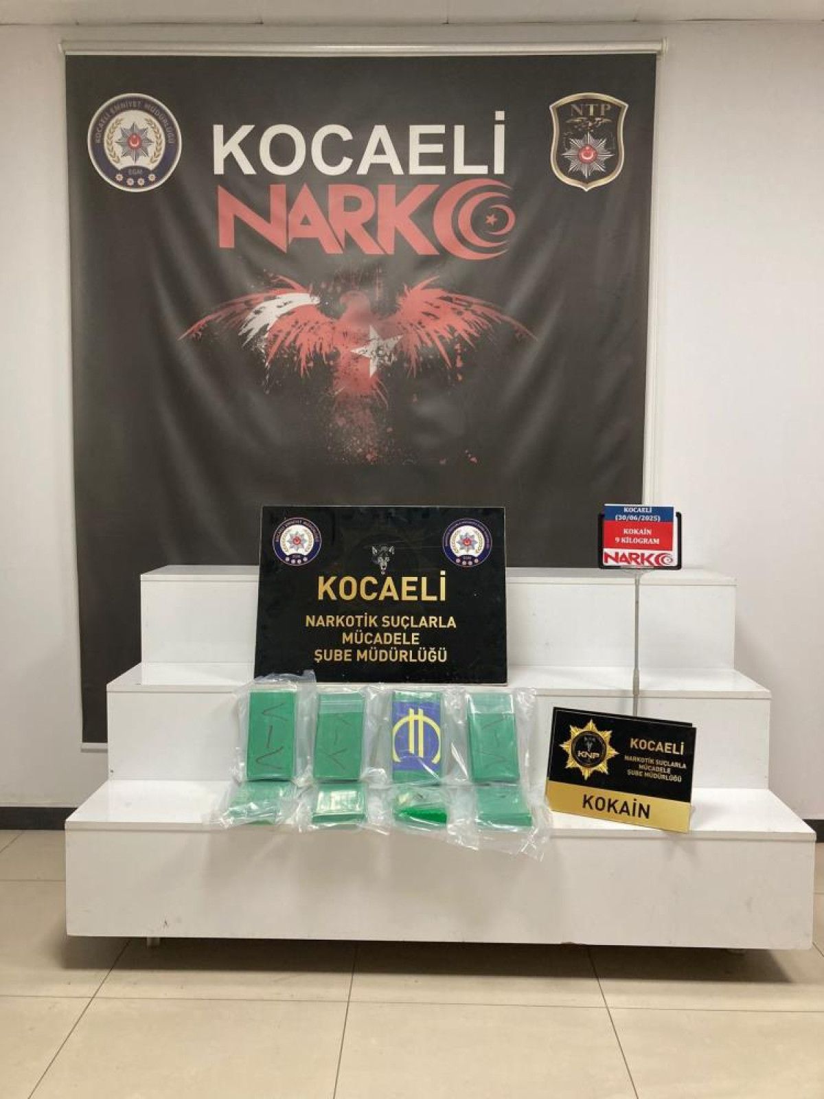 Araçta dedektör köpeğinin de iştirakiyle yapılan aramada kolilerin ortasına gizlenen 9 kilogram kokain ele geçirildi.