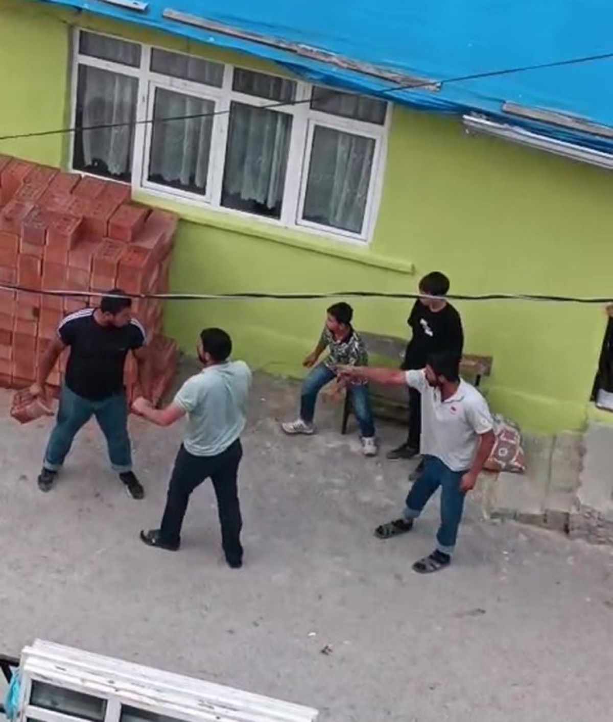 2 kişi ellerine geçirdikleri tuğlalarla birbirine saldırırken öbür 2 kişi yumruklarla hengame etti.