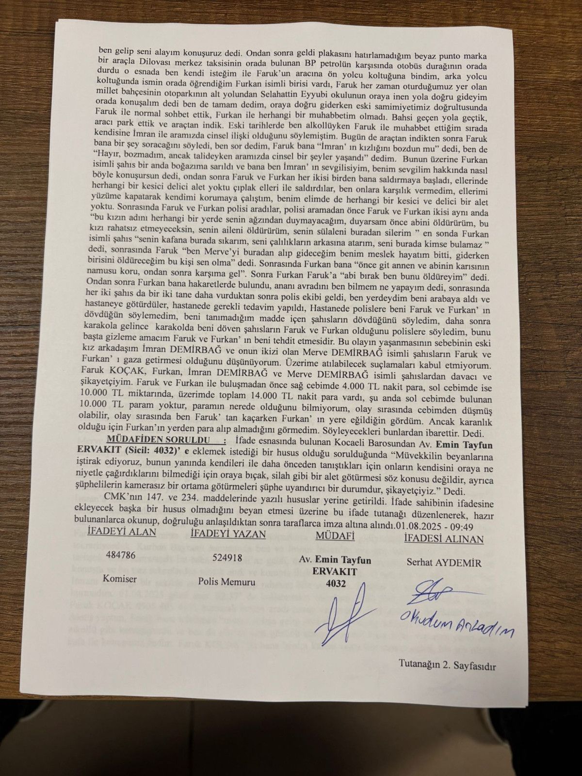 Sözlüsünden ayrılmadan evvel alkollüyken F.K.’ye, İ.D. ile ortalarında cinsel münasebet yaşadıklarını anlattığını tabir eden Serhat Aydemir, olay yerine gelindiğinde daima birlikte araçtan indikten sonra, F.K.’nin kendisine mevzuyu hatırlattığını, başka polis memurunun ise bu sırada İ.D. ile sevgili olduğunu söyleyerek, “Benim sevgilim hakkında nasıl bu türlü konuşursun?” dediğini ve bir anda her ikisinin de kendisine saldırdığını söyledi.