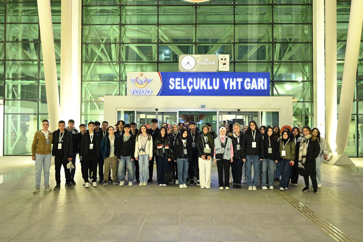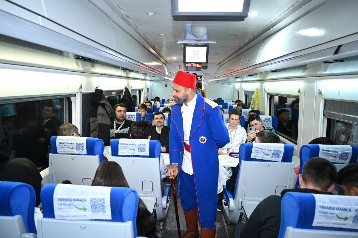 Sabah erken saatlerde rehberler eşliğinde Konya’dan Yüksek Süratli Tren’e binen öğrencilere seyahat sırasında tarihi karakterlerin canlandırıldığı tiyatro şovları sunuluyor.
