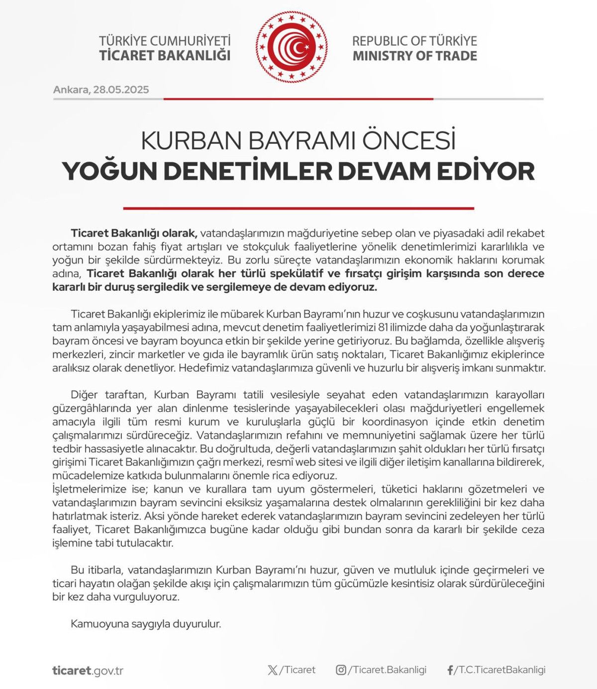 Denetimlerin yalnızca alışveriş merkezleriyle sonlu olmadığına dikkat çekilen açıklamada, karayolu güzergahlarında bulunan dinlenme tesislerinde de denetimlerin sıklaştırılacağı belirtildi.