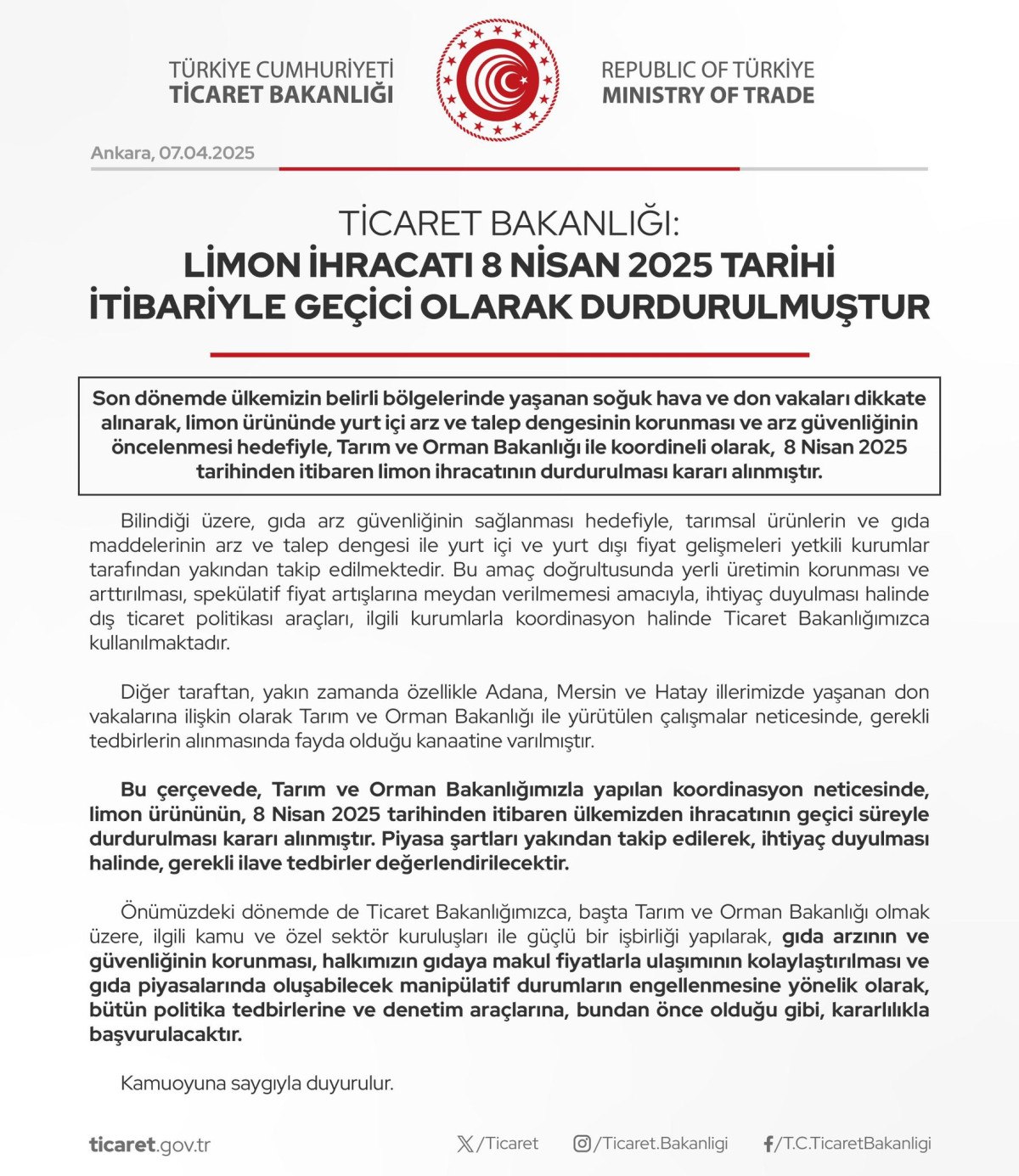 Ticaret Bakanlığı, Türkiye’nin bazı bölgelerinde yaşanan soğuk hava ve don olaylarının limon üretimini olumsuz etkilediğini belirterek, 8 Nisan 2025 tarihinden itibaren limon ihracatının geçici olarak durdurulduğunu açıkladı.