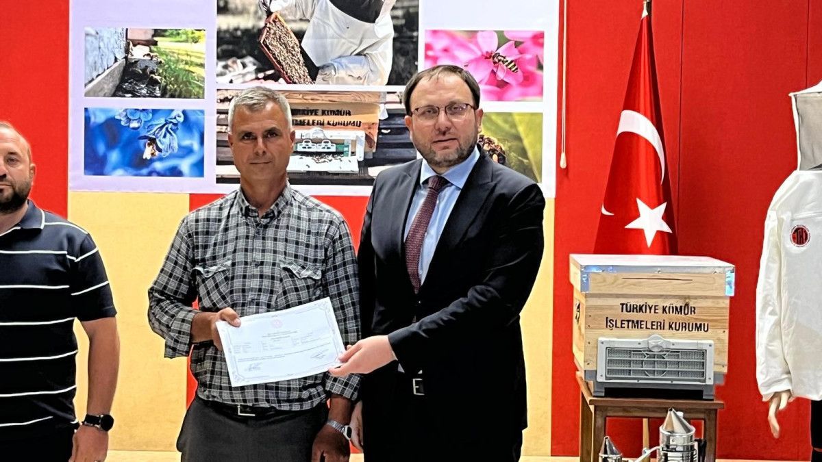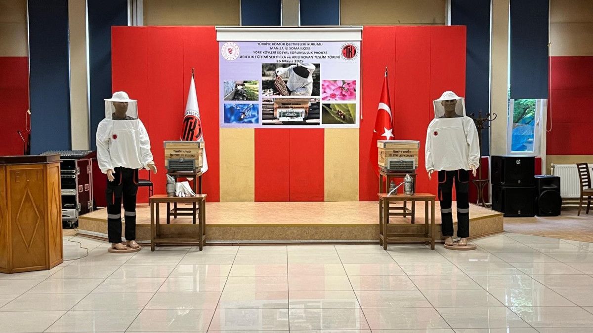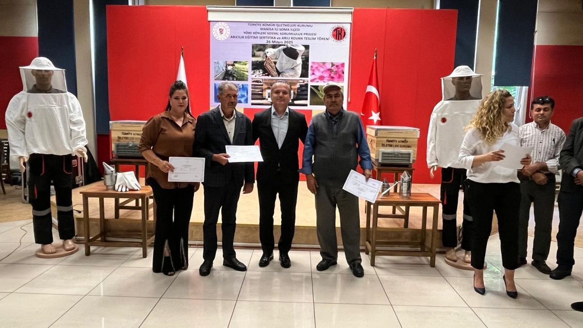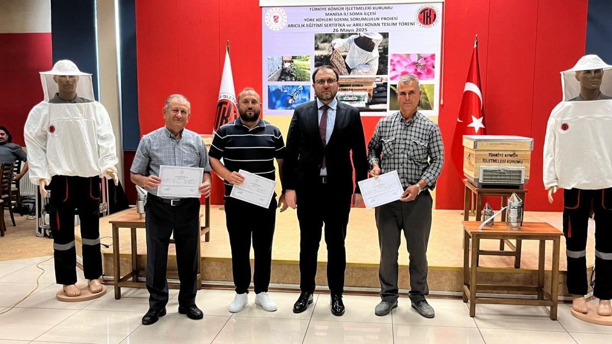 Ege Linyitleri İşletmesi’ne (ELİ) ilişkin Çok Hedefli Salon’da düzenlenen merasimde, temel arıcılık eğitimini muvaffakiyetle tamamlayan 52 vatandaşa sertifikaları ile birlikte arılı kovan ve ekipmanları teslim edildi.