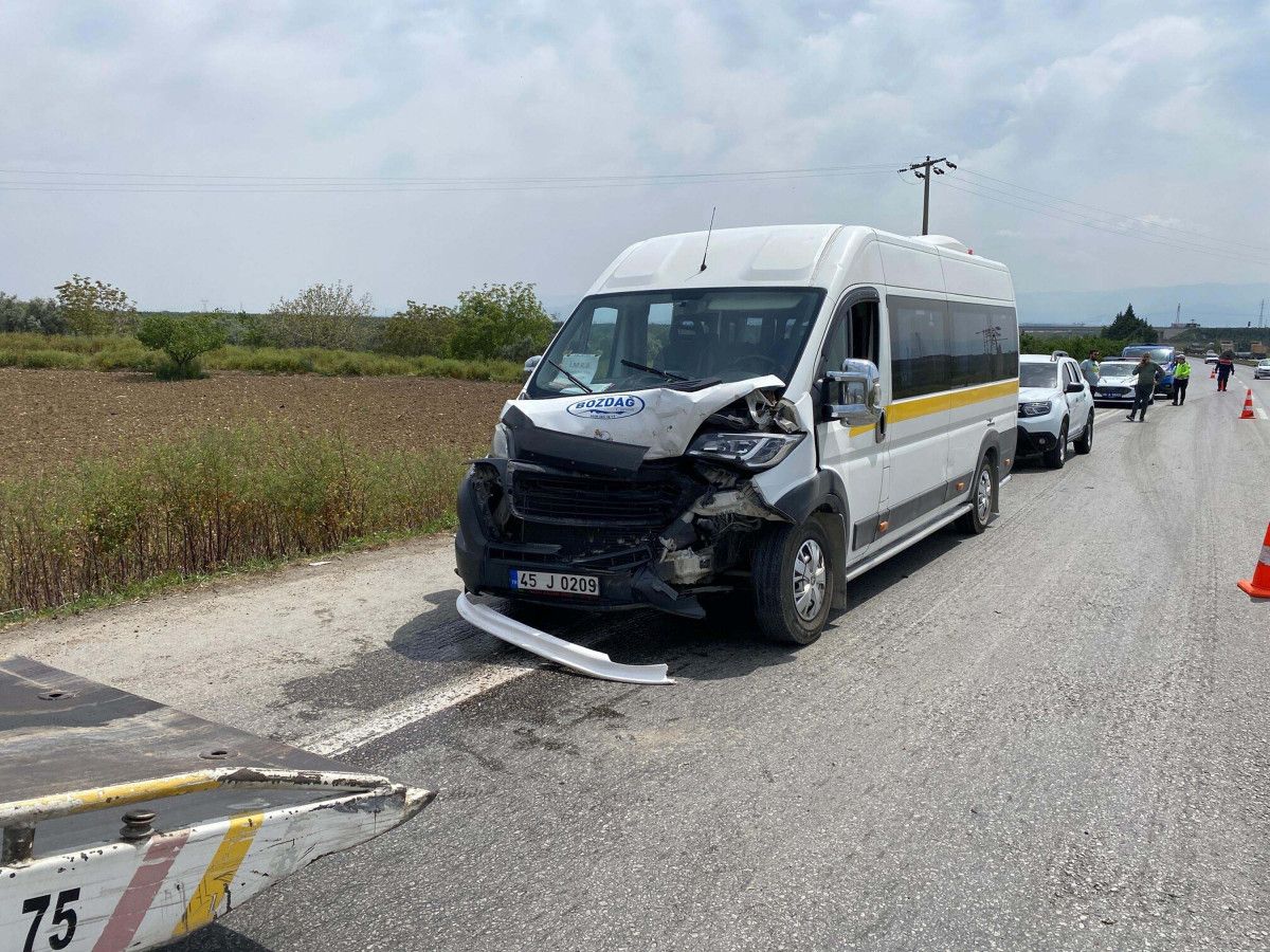 Manisa’nın Turgutlu ilçesinde, Yunusemre Atatürk Ortaokulu öğrencilerini taşıyan Ruhi Çelik yönetimindeki servis minibüsü, aynı okulun öğrencilerini taşıyan ve radar görünce aniden fren yaptığı öne sürülen Tarık Bozdağ’ın kullandığı servis minibüsüne arkadan çarptı.