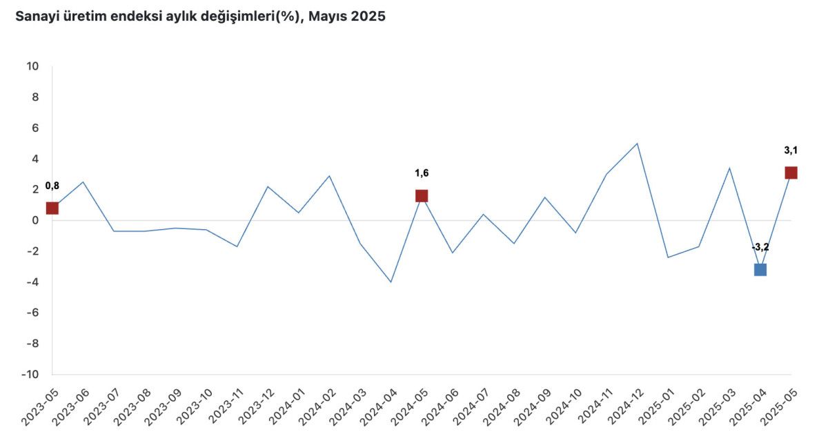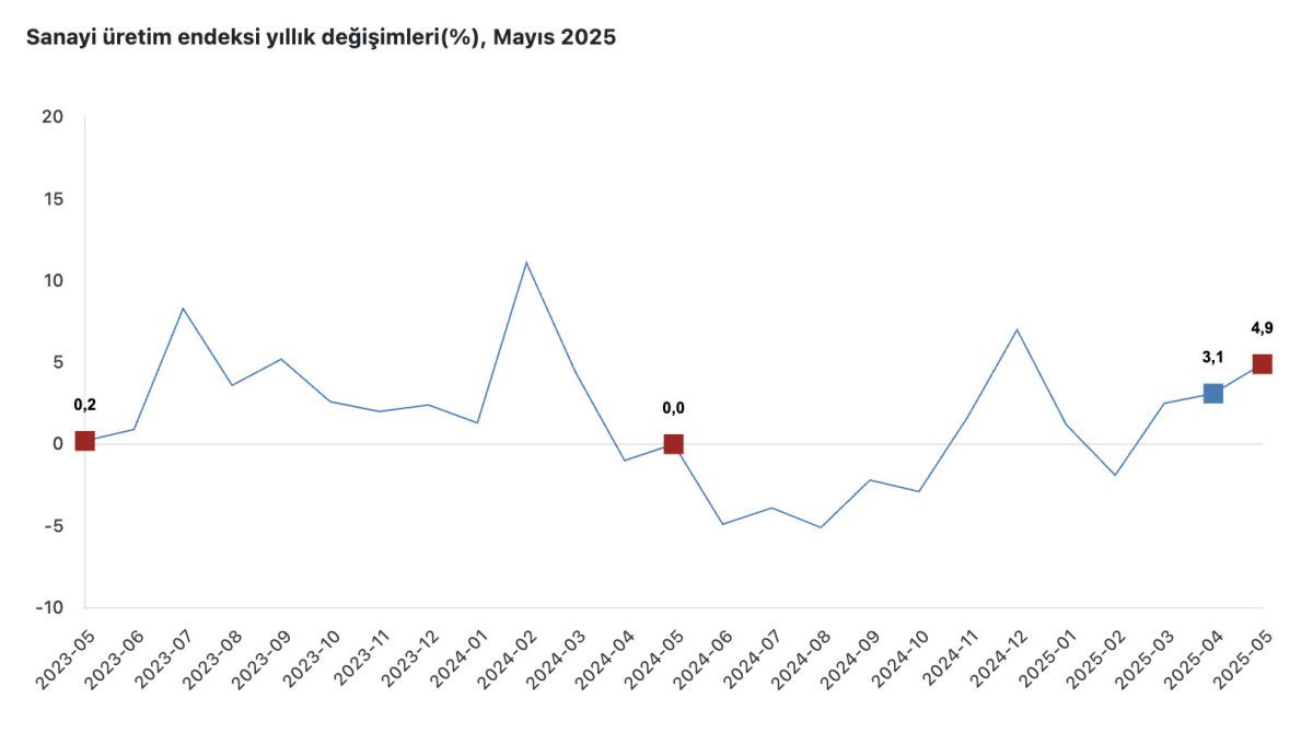 Buna nazaran, sanayi üretim endeksi mayısta aylık bazda yüzde 3,1, yıllık bazda yüzde 4,9 artış gösterdi.