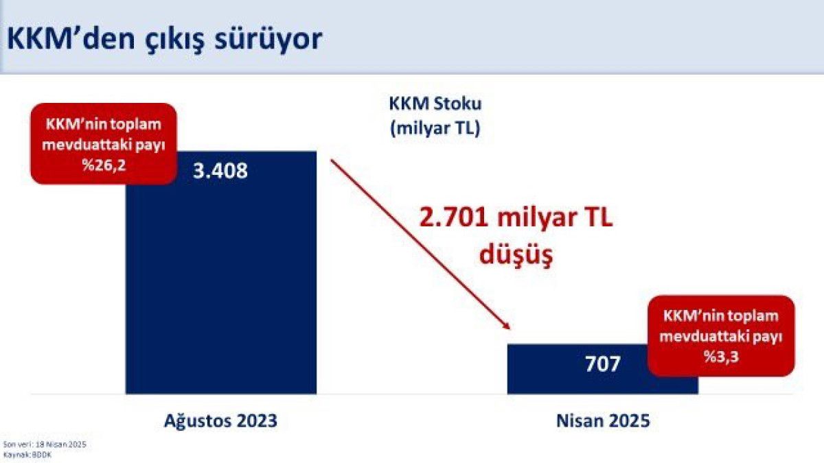 Buna göre Kur Korumalı Türk Lirası Mevduat ve Katılma Hesapları (KKM), geçen hafta 21 milyar 505 milyon lira azalarak 706 milyar 586 milyon liraya düştü.