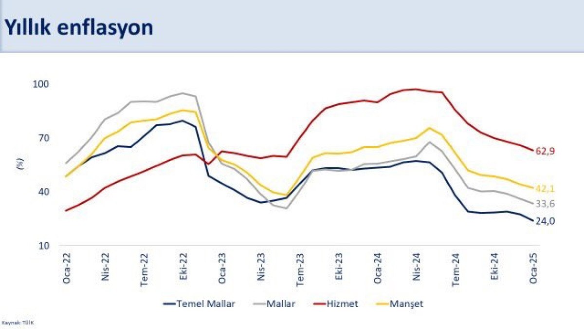 Ocakta yıllık enflasyon geçen yıla göre 23 puan azalarak yüzde 42,1’e geriledi.