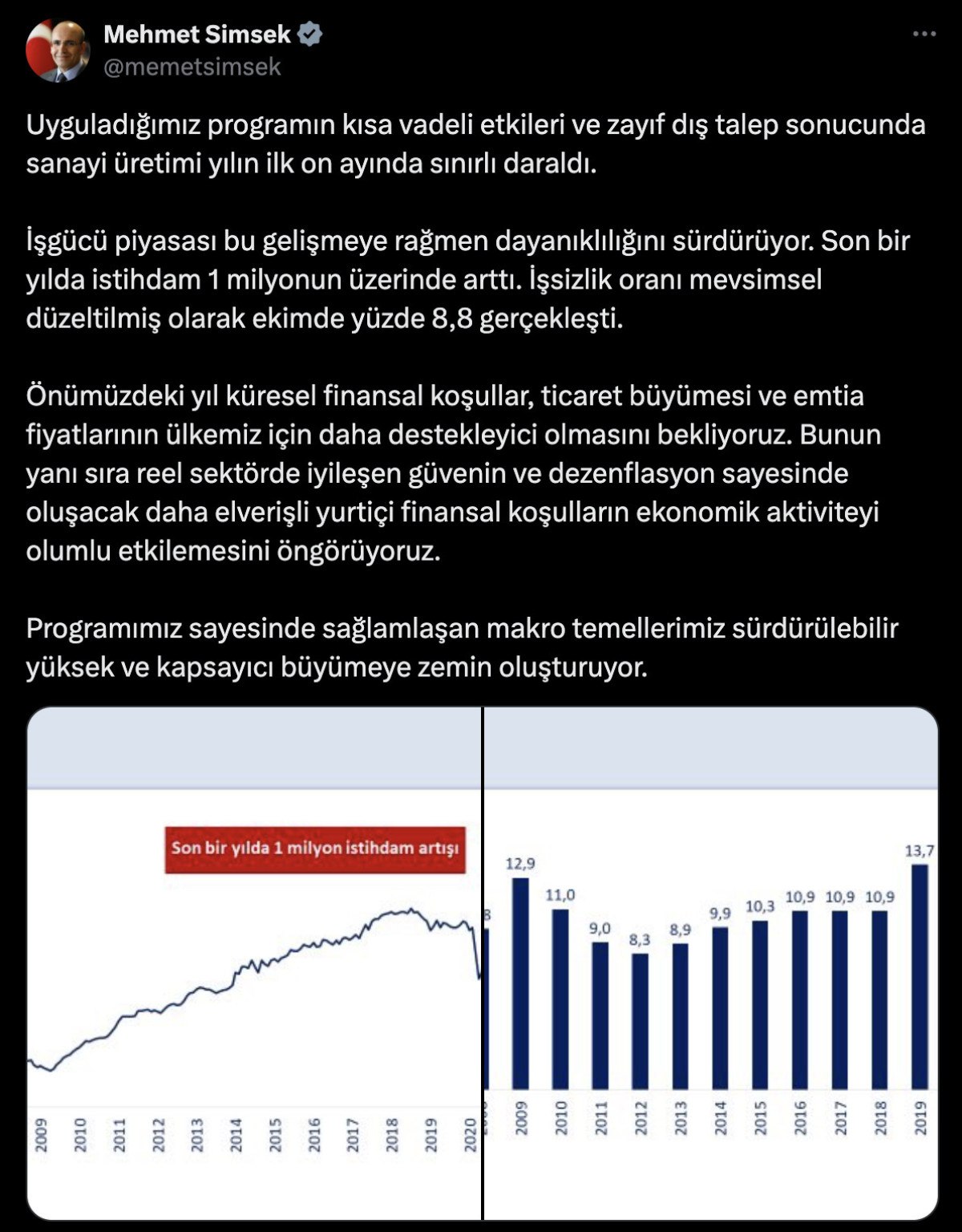 Sanayi üretimi ile istihdam verilerini değerlendiren Hazine ve Maliye Bakanı Mehmet Şimşek, sosyal medya platformu X üzerinden paylaşımda bulundu.