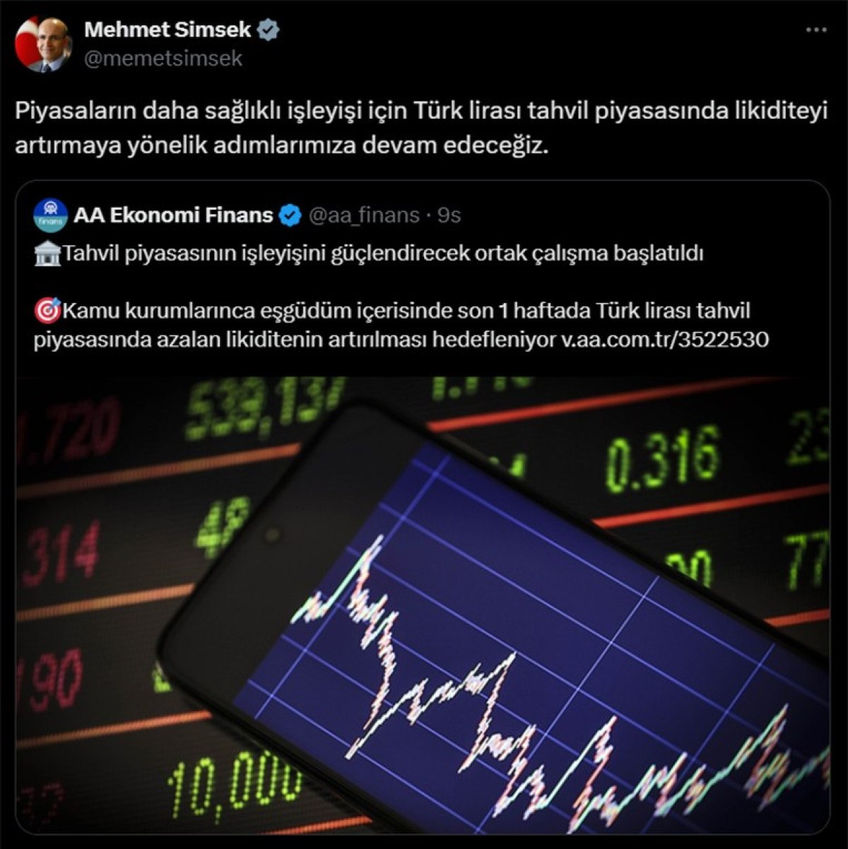 Hazine ve Maliye Bakanı Mehmet Şimşek, kamu kurumlarınca eşgüdüm içerisinde son 1 haftada Türk Lirası tahvil piyasasında azalan likiditenin artırılması çalışmalarıyla ilgili sosyal medya hesabından paylaşım yaptı.