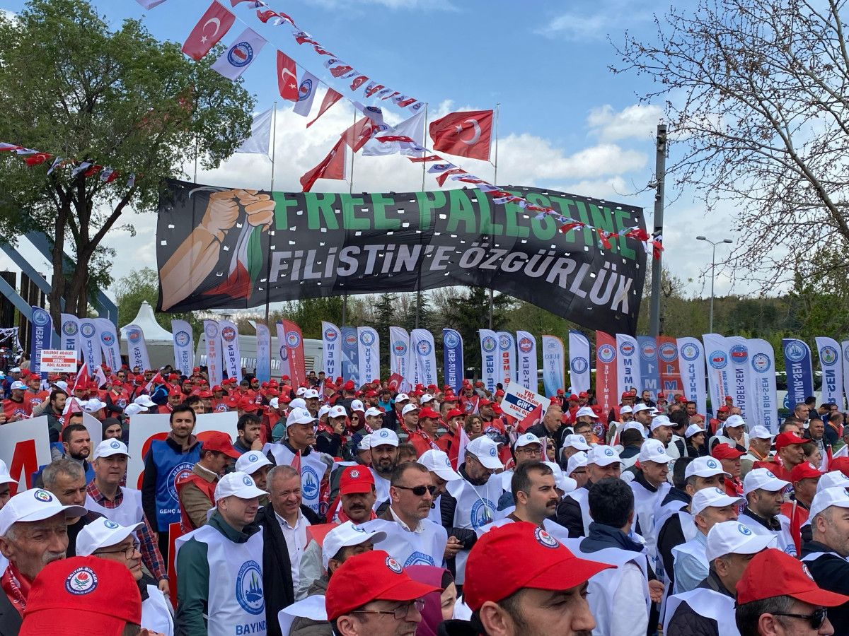 Krizlerin faturasının işçiye kesilmemesi için, insan onuruna yaraşır bir çalışma hayatı için, teminatlı, takımlı istihdam, adam üzere sendika yasası, hakikat düzgün kamu işçi sistemi, vergide adalet için buradayız. Bugün adil bölüşümü haykırmak, ‘Dünya 5’ten, emek sermayeden büyüktür’ demek için, barış, kardeşlik, birlik, beraberlik, emek ve ekmek için buradayız.