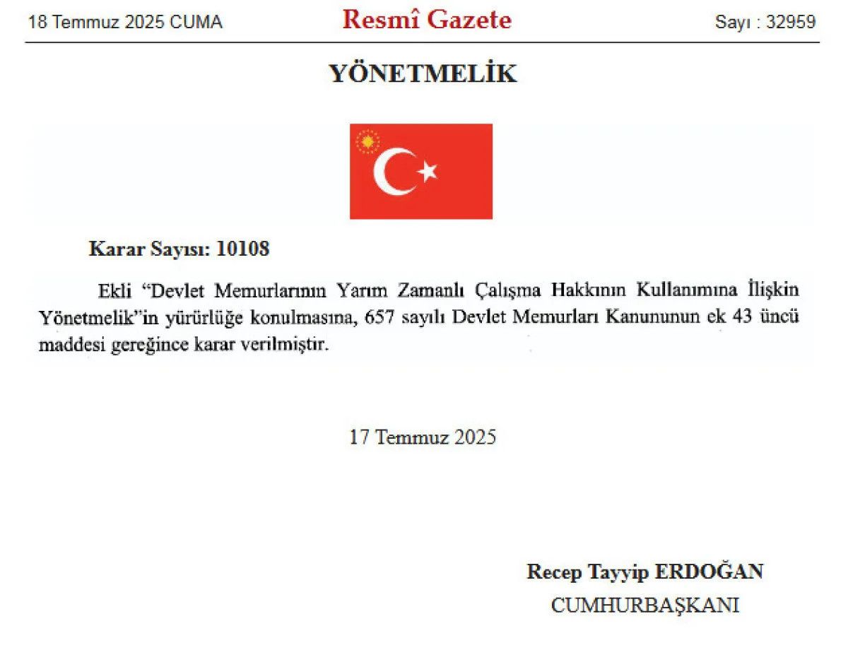 “Devlet Memurlarının Yarım Vakitli Çalışma Hakkının Kullanımına Ait Yönetmelik” Resmi Gazete’de yayımlanarak yürürlüğe girdi.