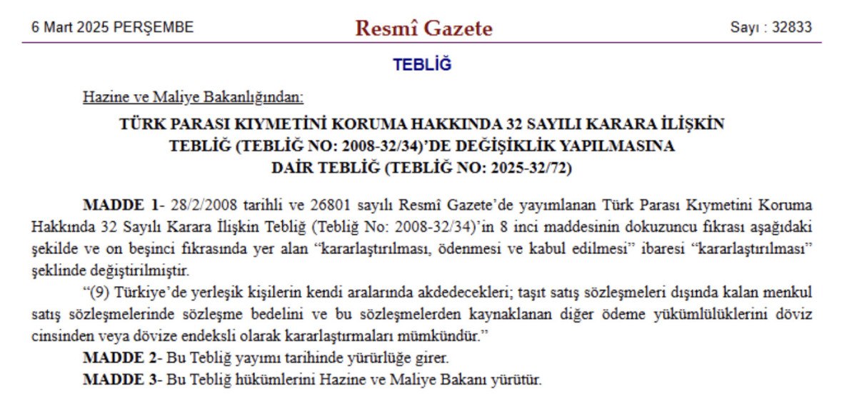 Resmi Gazete’de yayımlanan düzenleme ile taşıt satış sözleşmeleri dışında kalan menkul satış sözleşmelerinde ödeme yükümlülükleri döviz cinsinden yapılabilecek.