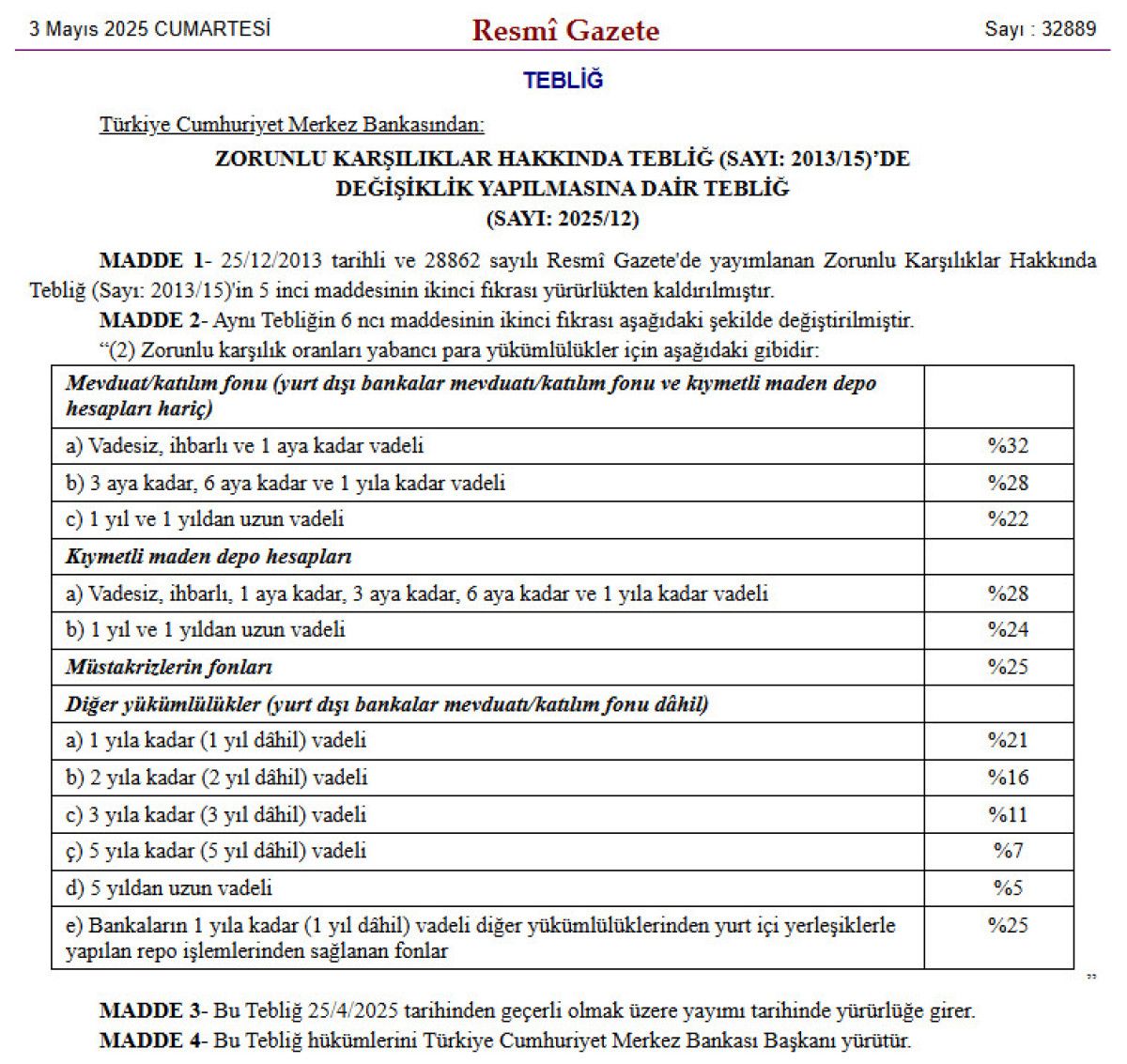 – Yurt içi yerleşiklerle yapılan, 1 yıla kadar vadeli yabancı para cinsi repo süreçlerinde sağlanan fonlar için mecburî karşılık oranı 400 baz puan artırıldı, ayrıyeten hesaplama yolu değiştirildi.
