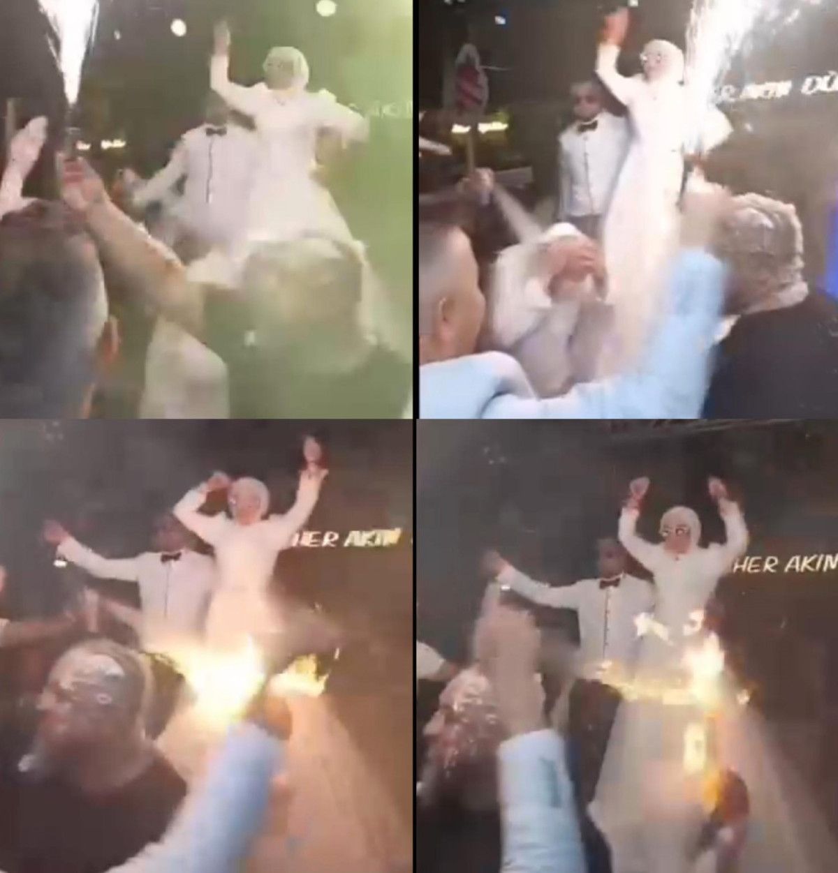 Gelin ve damat pistte dans ederken düzenlenen köpüklü ve meşaleli cümbüş sırasında konuklardan birinin başına istenmeyen bir olay geldi.