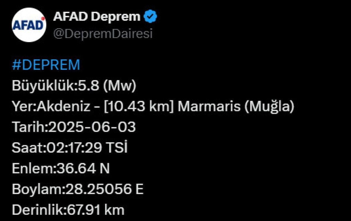 Muğla’nın Marmaris ilçesine 10,43 kilometre uzaklıktaki sarsıntının 67,91 kilometre derinlikte meydana geldiği belirlendi.