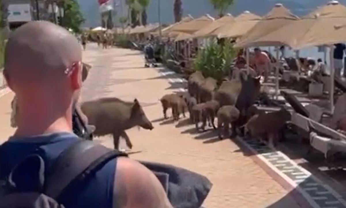 CHP’li Marmaris ilçesinde toplanmayan çöpleri karıştıran yaban domuzları sıradan hale gelirken, domuzların bu seferki durağı kıyılar oldu.