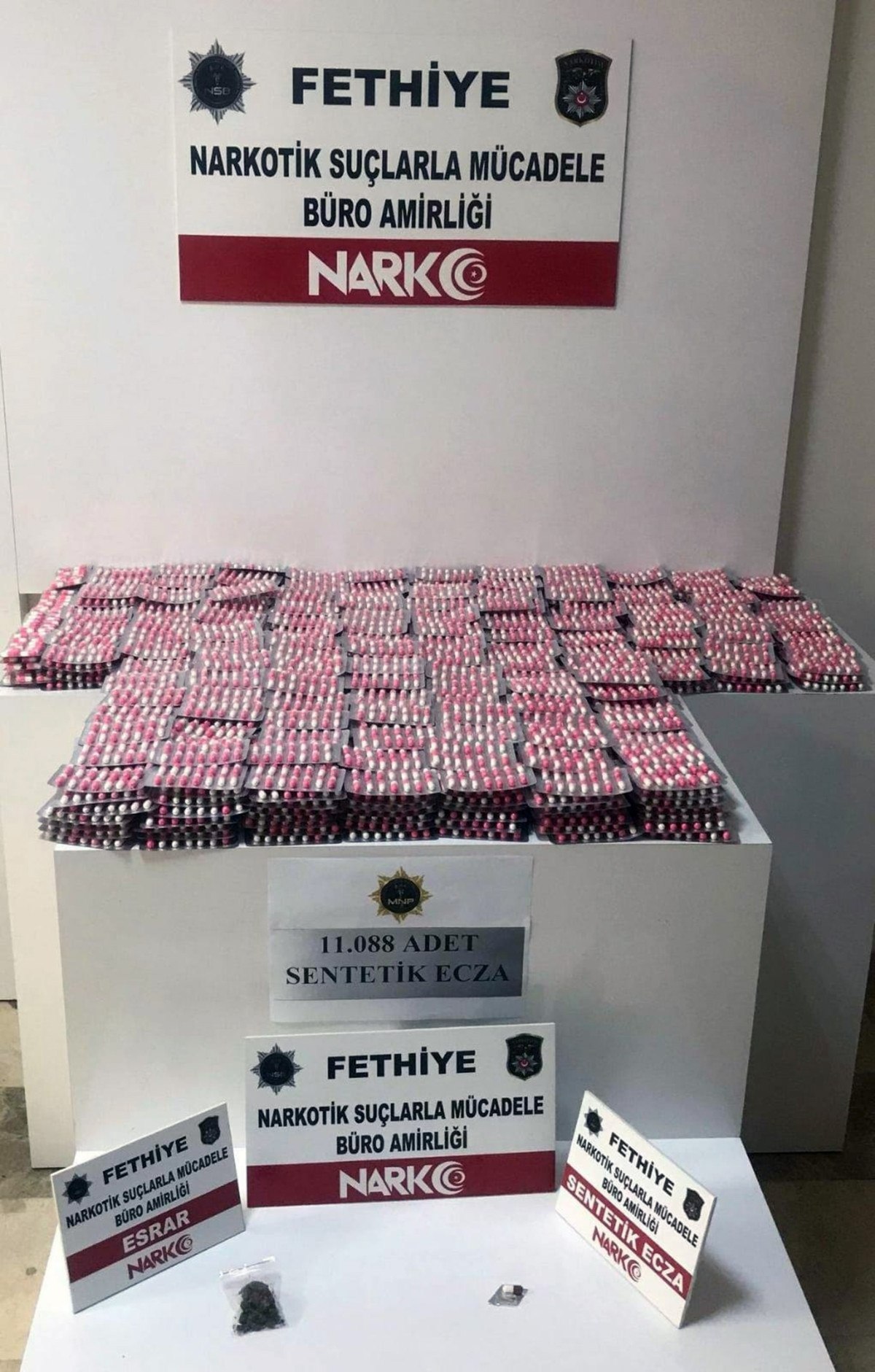 Yapılan aramada, 4 kuşkulu şahıs, 11 bin 089 adet sentetik ecza ve 5,5 gram esrar ele geçirildi.