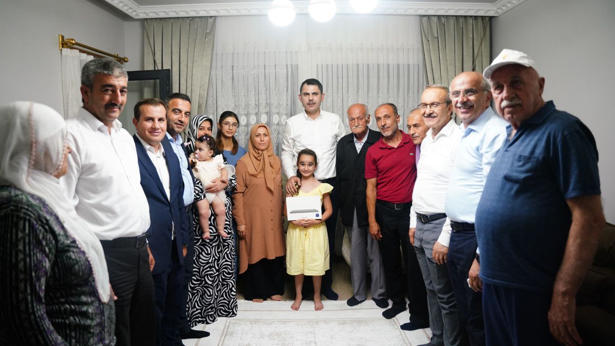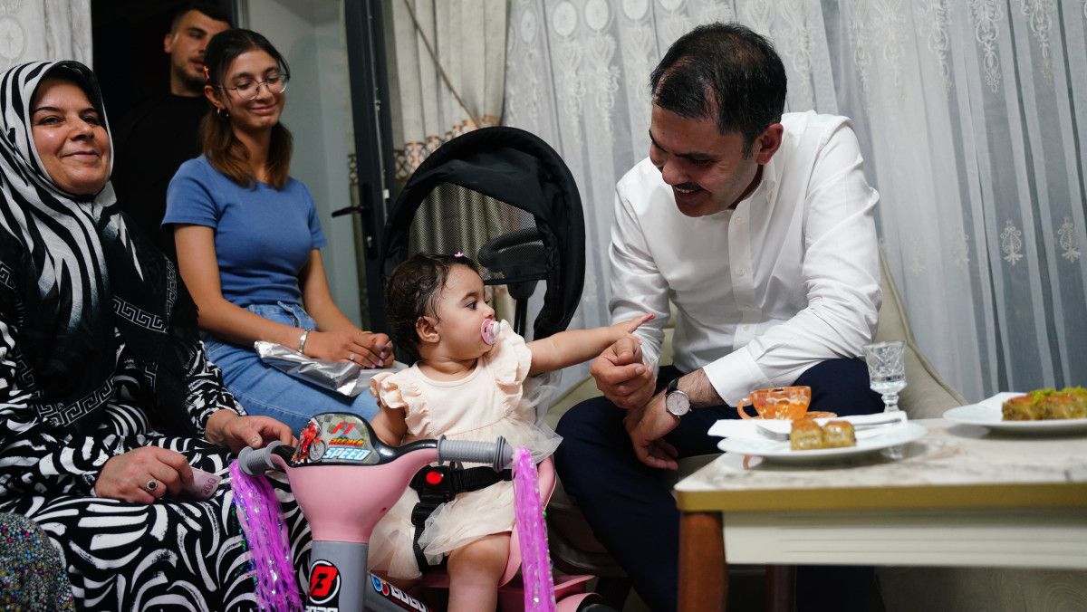 Bakan Kurum akabinde TOKİ konutlarında oturan depremzede Güde ailesini ziyaret etti.