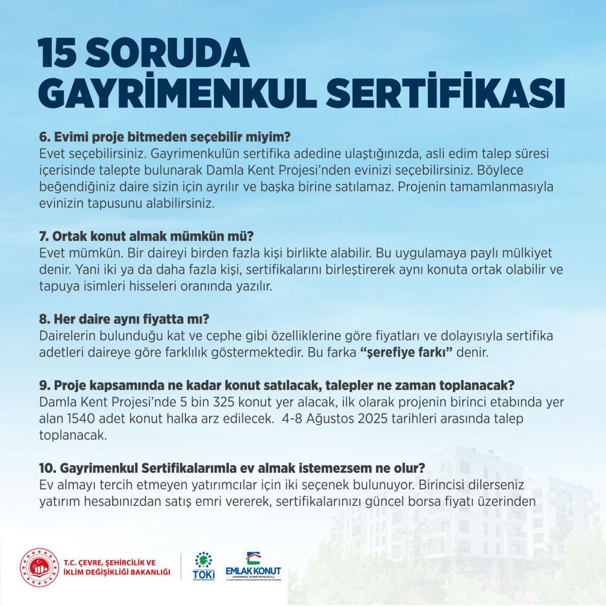 Çevre, Şehircilik ve İklim Değişikliği Bakanı Murat Kurum, kamuoyunda ilgi gören Gayrimenkul Sertifikası modeliyle ilgili merak edilen soruları ve yanıtlarını toplumsal medya hesabından “Görüyorum ki; dün açıkladığımız küçük birikimlerle konut alma projemize ilgi büyük ve merak edilen birçok bahis var. Birinci olarak İstanbul’da başlattığımız Gayrimenkul Sertifikasıyla ilgili 15 soru 15 karşılık burada” notuyla paylaştı.