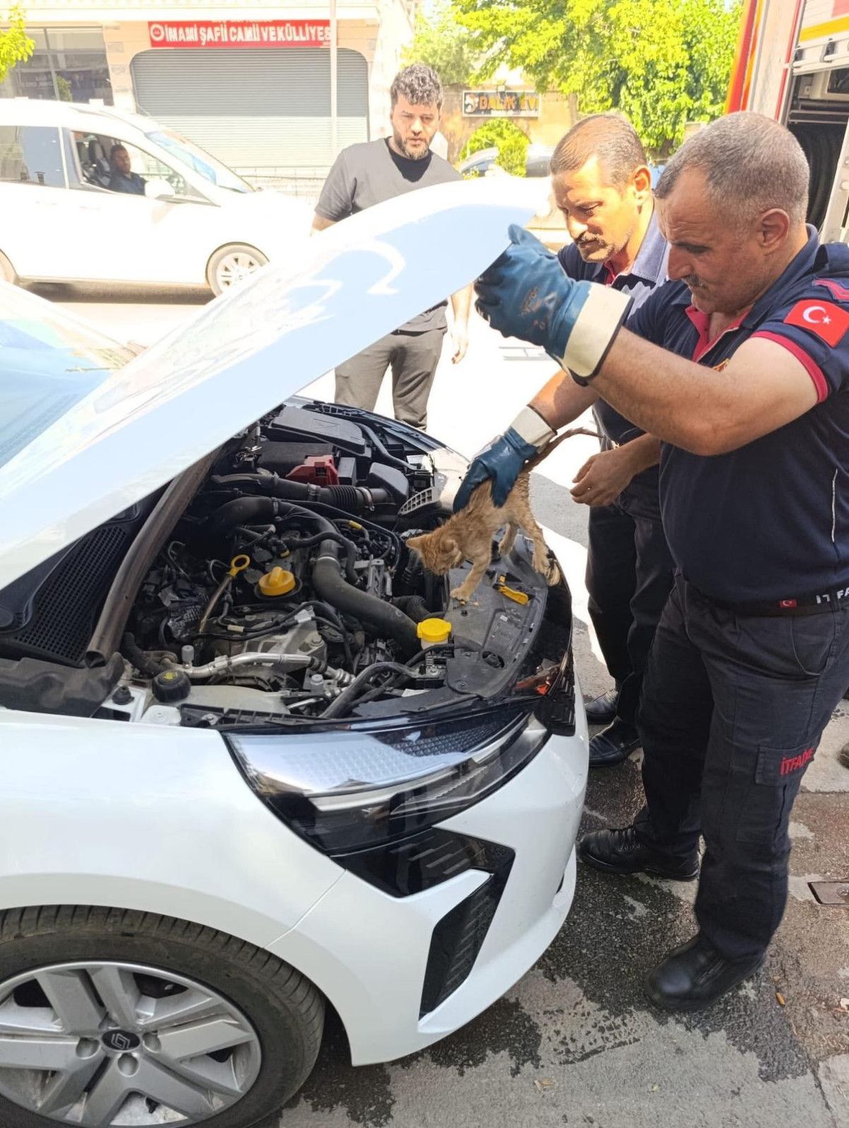 Aracın kaputunu açarak çalışma başlatan gruplar, motor kısmına sıkışan yavru kediyi dikkatli bir halde bulunduğu yerden çıkardı.