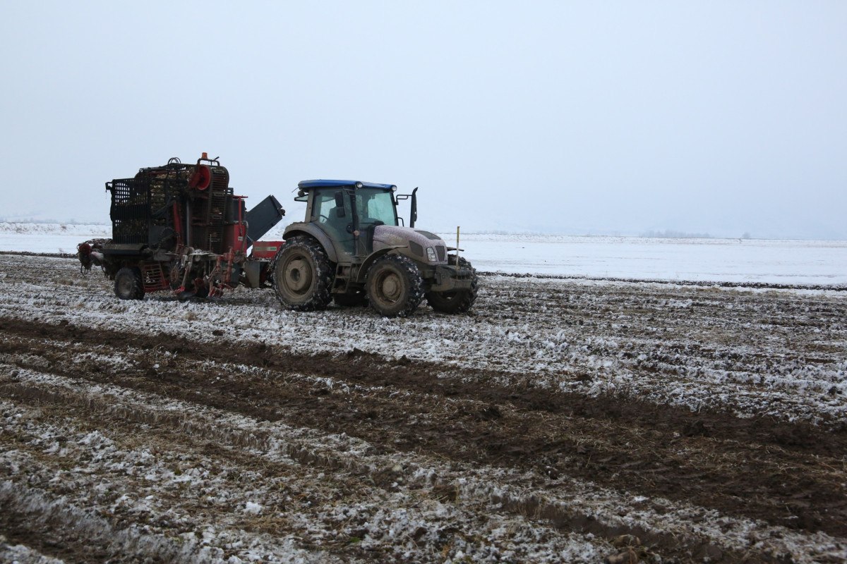 Kar yağışı tarım arazilerini beyaza bürürken, pancarı kar altında kalan çiftçilerin mesaisini artırdı.