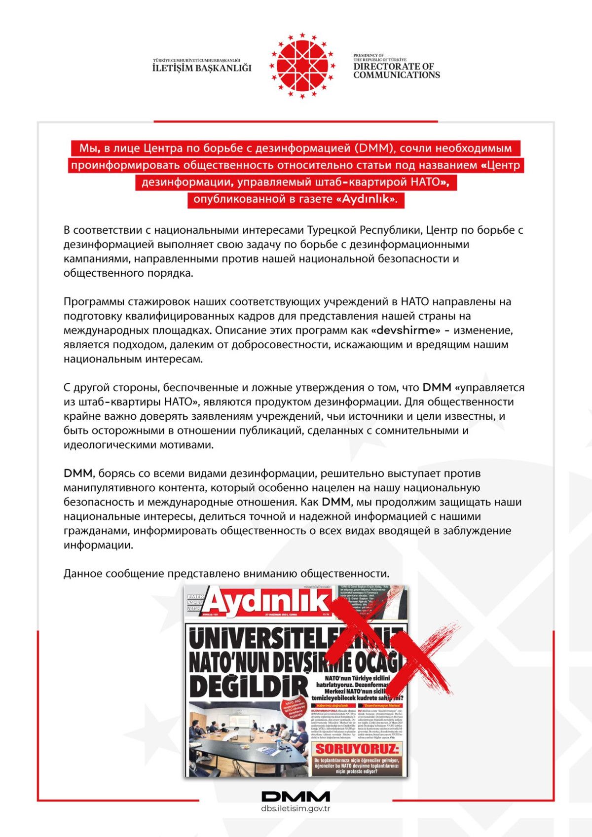 DMM’nin ‘NATO karargahından yönetildiği’ formundaki mesnetsiz ve gerçek dışı tezler dezenformasyon eseridir. Kamuoyunun, kaynağı ve hedefi belirli olan kurumların açıklamalarına prestij etmesi, şaibeli ve ideolojik saiklerle yapılan yayınlara karşı dikkatli olması büyük değer taşımaktadır.