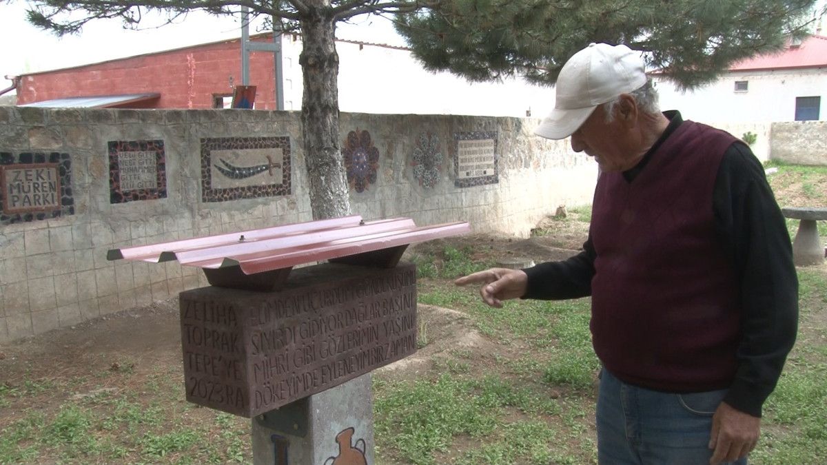 Eşinin anısına, meskeninin bahçesini şiirlerle donatarak bir anıt parka dönüştürdü.