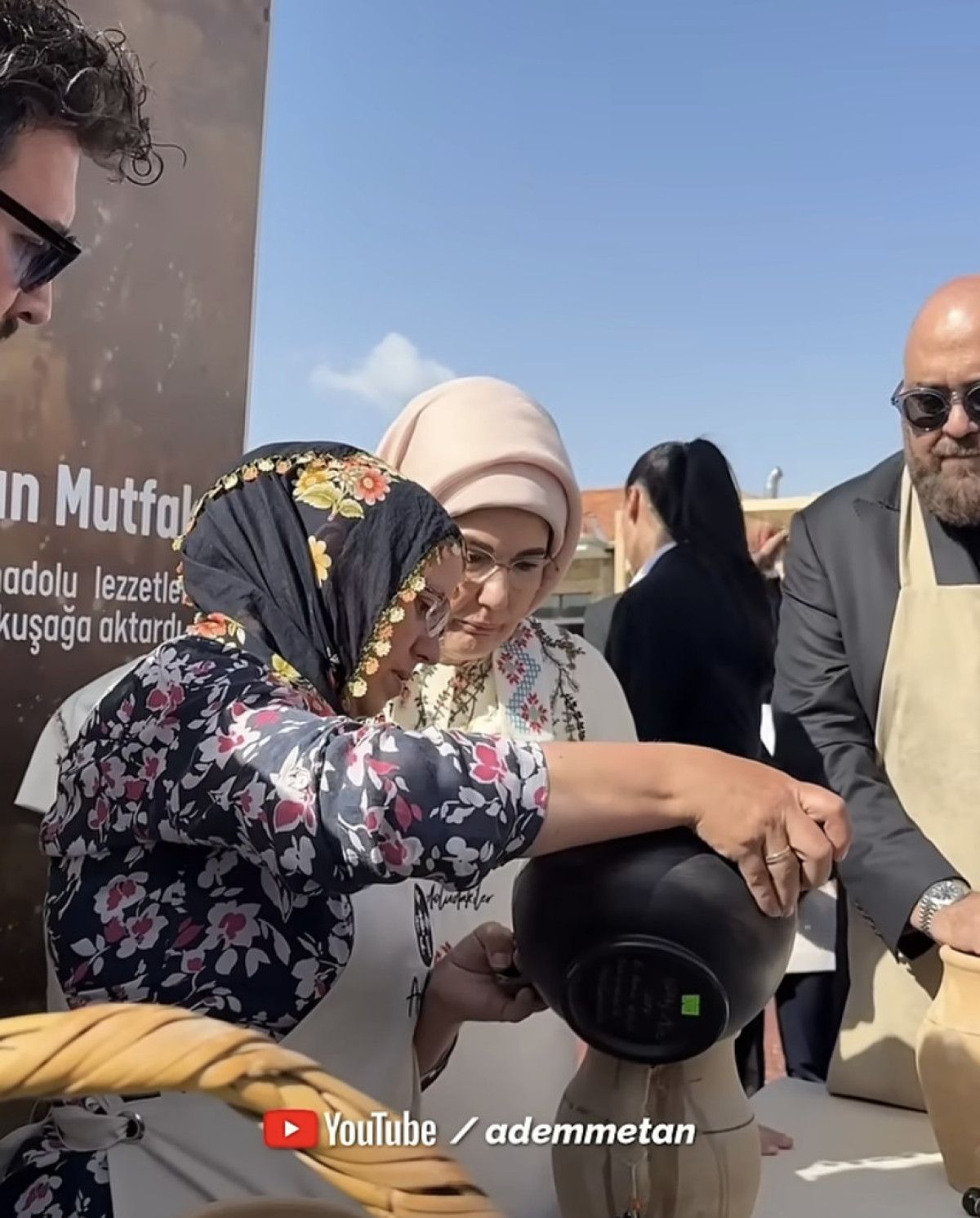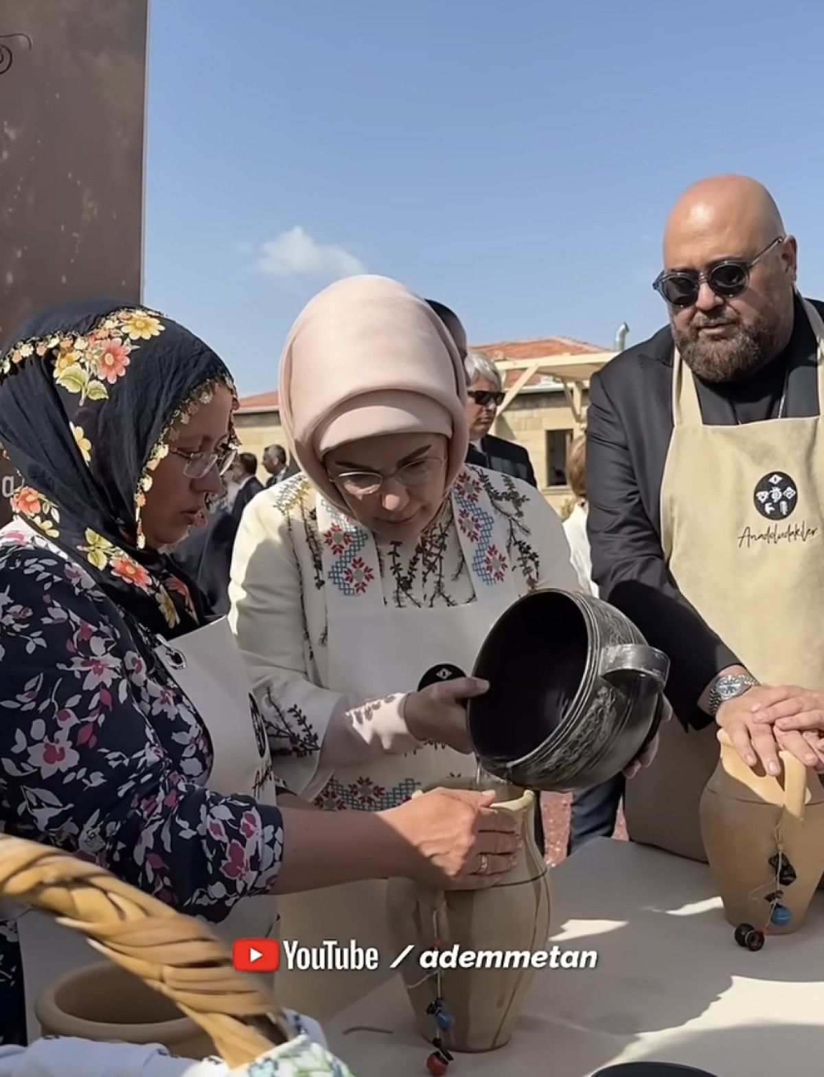 Emine Erdoğan, yaprak basması üzerine Kapadokya’da bir ortaya geldiği bayanlardan birisiyle uzun mühlet sohbet etti.